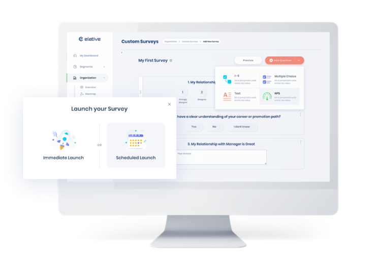 With Eletive, you can tailor your employee engagement surveys and send them at the frequency that works best for your company. The surveys come with a science-based question battery developed by psychologists, that you can also change and add to if needed.