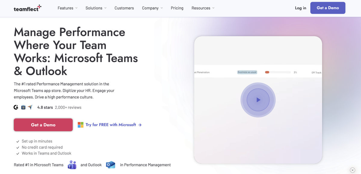 Teamflect brings performance reviews, OKRs, feedback, and engagement surveys directly into Microsoft Teams and Outlook. Instead of requiring employees to log into a separate HR platform, it embeds performance management within the tools they already use daily.