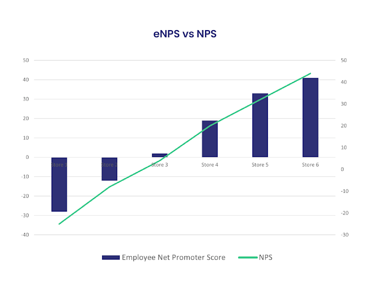 Looking at the relation between your Employee Net Promoter Score (eNPS) and your NPS score provides valuable insights into the link between employee satisfaction and business performance.
