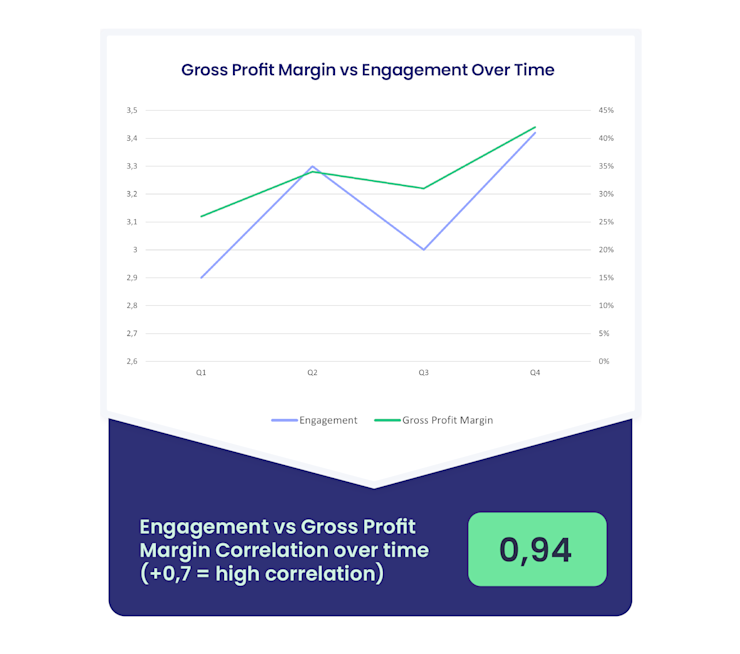 By employing statistical methods such as Pearson’s correlation, it becomes possible to quantitatively assess the relationship between these two critical metrics. In the example below, analysis of the Gross Profit Margin alongside engagement levels reveals a very strong positive correlation coefficient of 0.94.