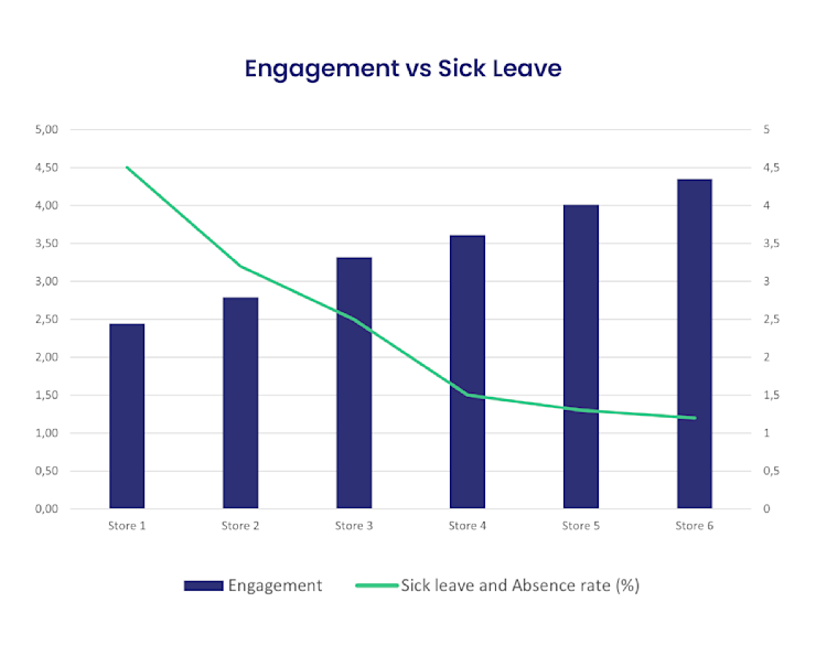 Companies often notice that higher engagement leads to lower absence rates, indicating that engaged employees are more satisfied, healthier, and more committed. This relationship is shown in the graph to the right.