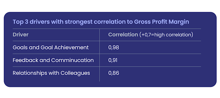 Analysing correlation between engagement drivers and KPIs will help you pinpoint which aspects of employee engagement have the most impact on your bottom line.